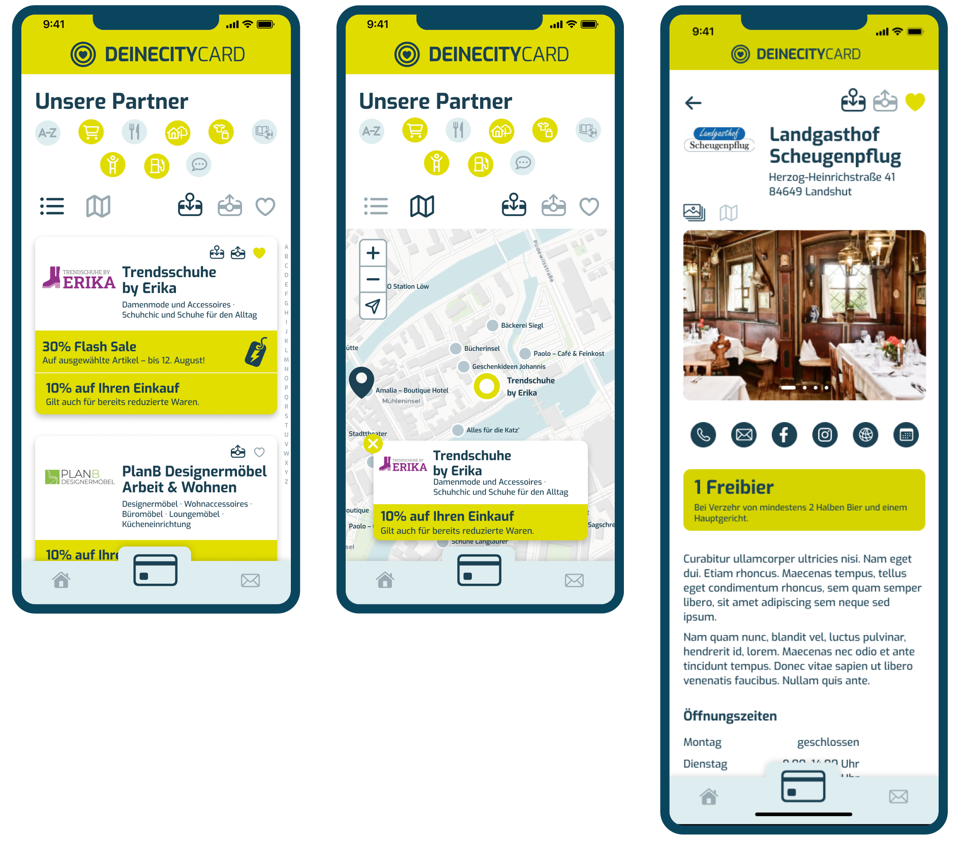 Mit der DeinecityCARD führen wir eine Karte ein, die zahlreiche Möglichkeiten vereint und um eine praktische CityApp ergänzt wird. Sie verbindet die Bürger aus Deinecity mit unseren lokalen Gewerbetreibenden.
